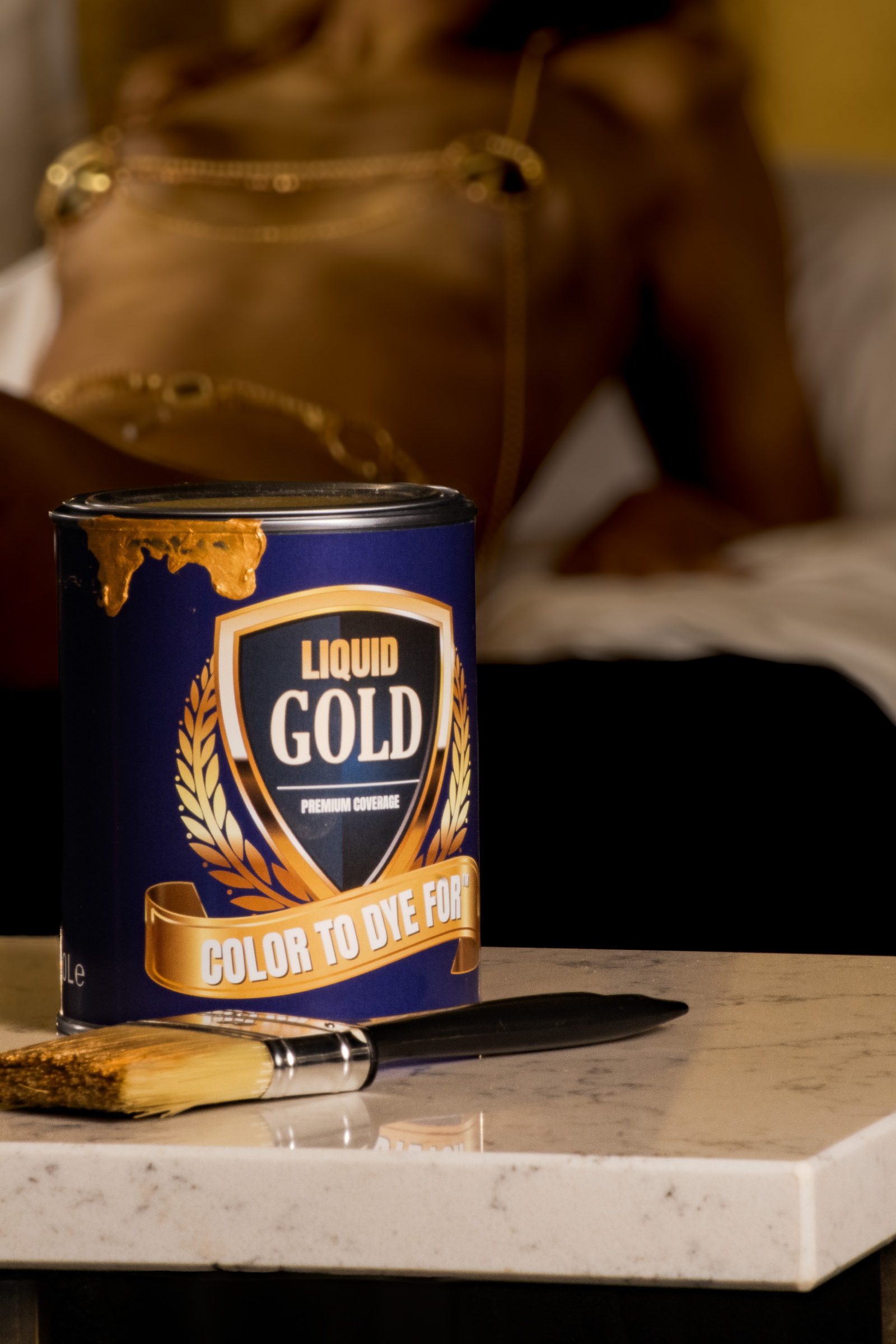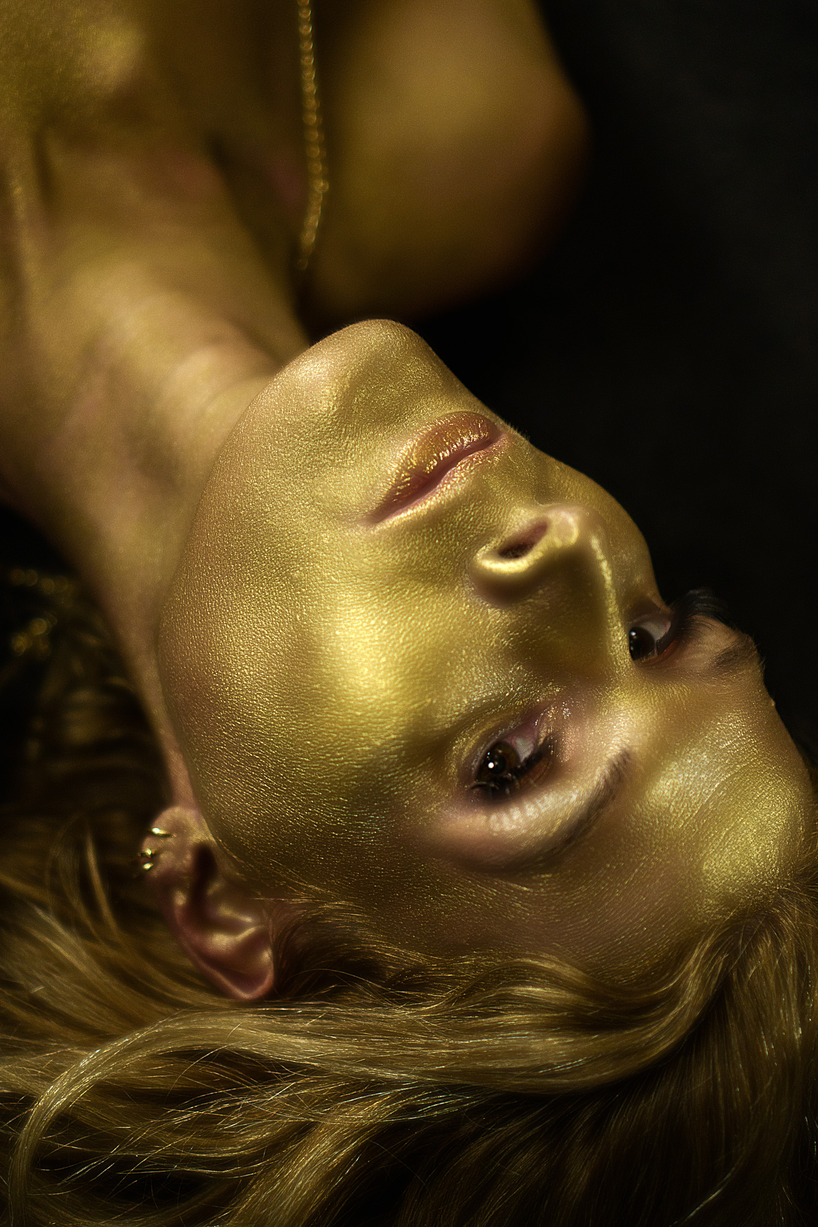 She’s covered in paint, gold paint.
